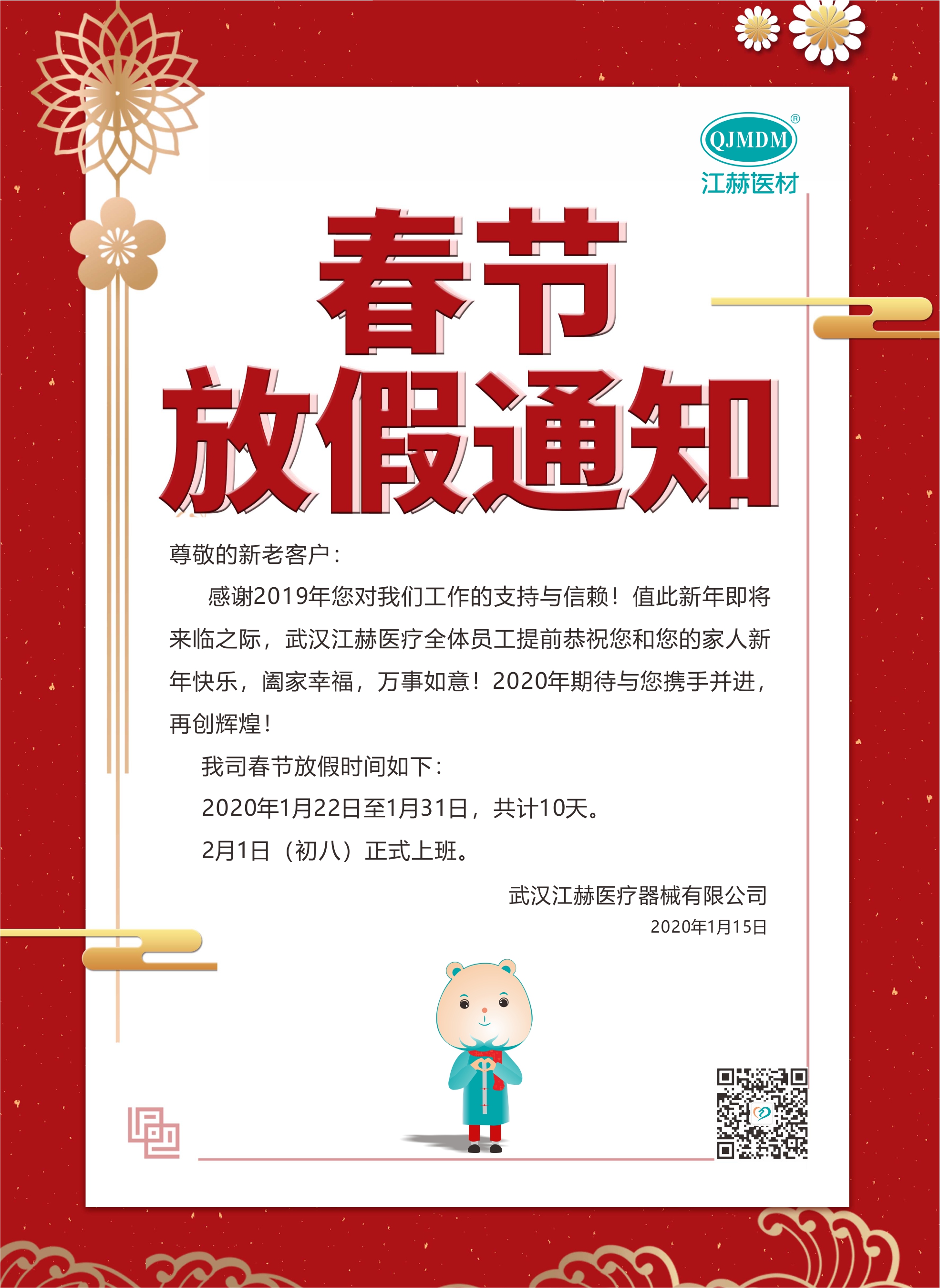 武漢江赫醫(yī)療器械有限公司于1月22日-1月31日放假2月1日(正月初八)正式上班!預(yù)祝大家新春快樂,“鼠”你好運(yùn)!