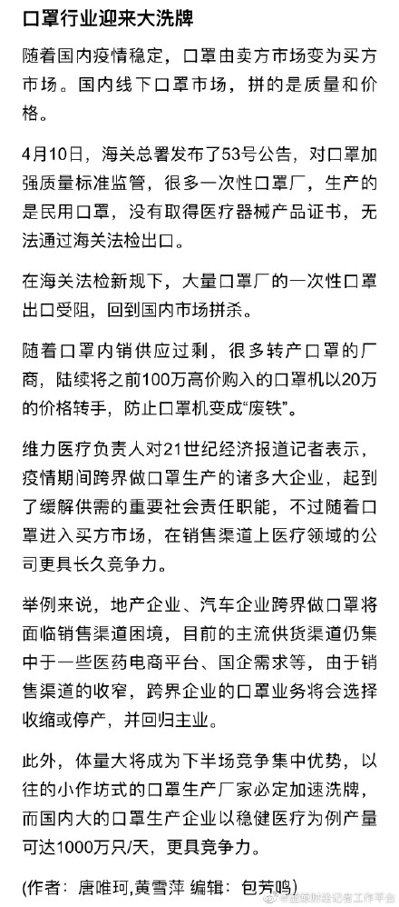 4月10日,海關總署發(fā)布了53號公告,對口罩加強質(zhì)量標準監(jiān)管,很多一次性口罩廠,生產(chǎn)的是民用口罩,沒有取得醫(yī)療器械產(chǎn)品證書,無法通過海關法檢出口。