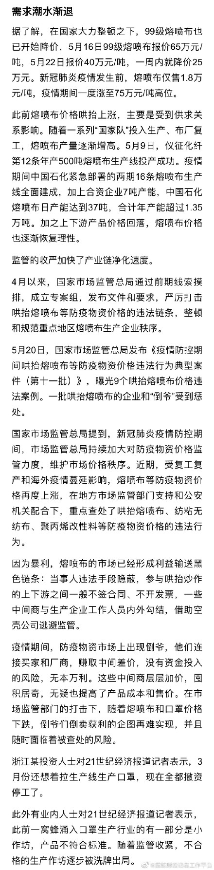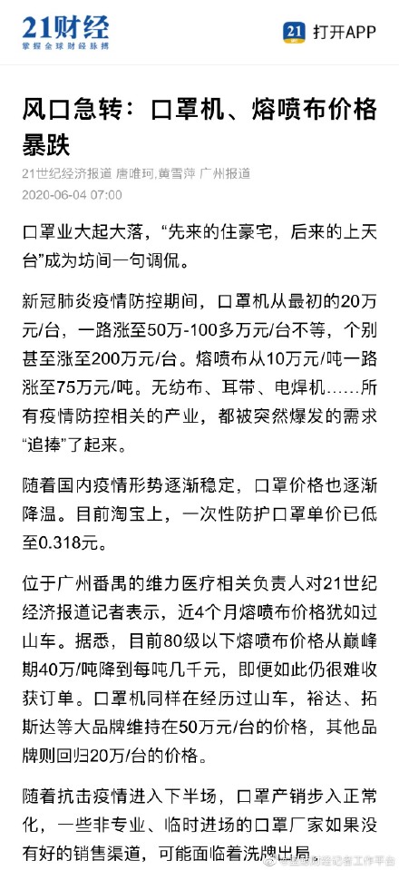 疫情防控期間,口罩機從最初的20萬元/臺,一路漲至50萬-100多萬元/臺不等,個別甚至漲至200萬元/臺。熔噴布從10萬元/噸一路漲至75萬元/噸。無紡布、耳帶、電焊機……所有疫情防控相關的產(chǎn)業(yè),都被突然爆發(fā)的需求“追捧”了起來。