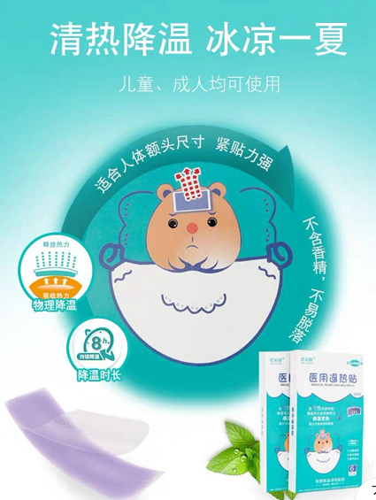 物理降溫是高熱患者除藥物治療外,最簡易、有效、安全的降溫方法。醫(yī)用退熱貼還由于其具有揮發(fā)性,可吸收并帶走大量的熱量,使體溫下降、癥狀緩解。大人小孩都可使用。